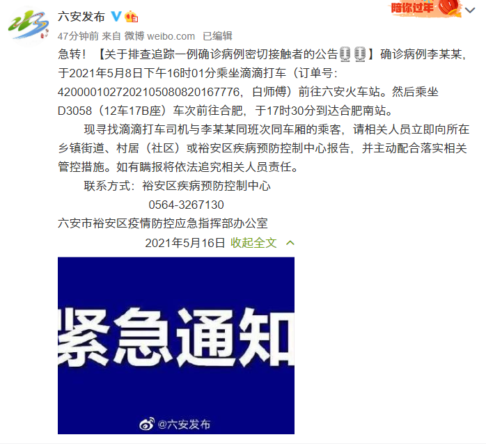 5月16日,安徽省六安市委、六安市人民政府官方微博发布公告,紧急排查追踪一例确诊病例密切接触者。此前该确诊病例患者曾乘坐滴滴和动车。 前述公告称,确诊病例李某某,于2021年5月8日下午16时01分乘坐滴滴打车(订单号:4200001027202105080820167776,白师傅)前往六安火车站