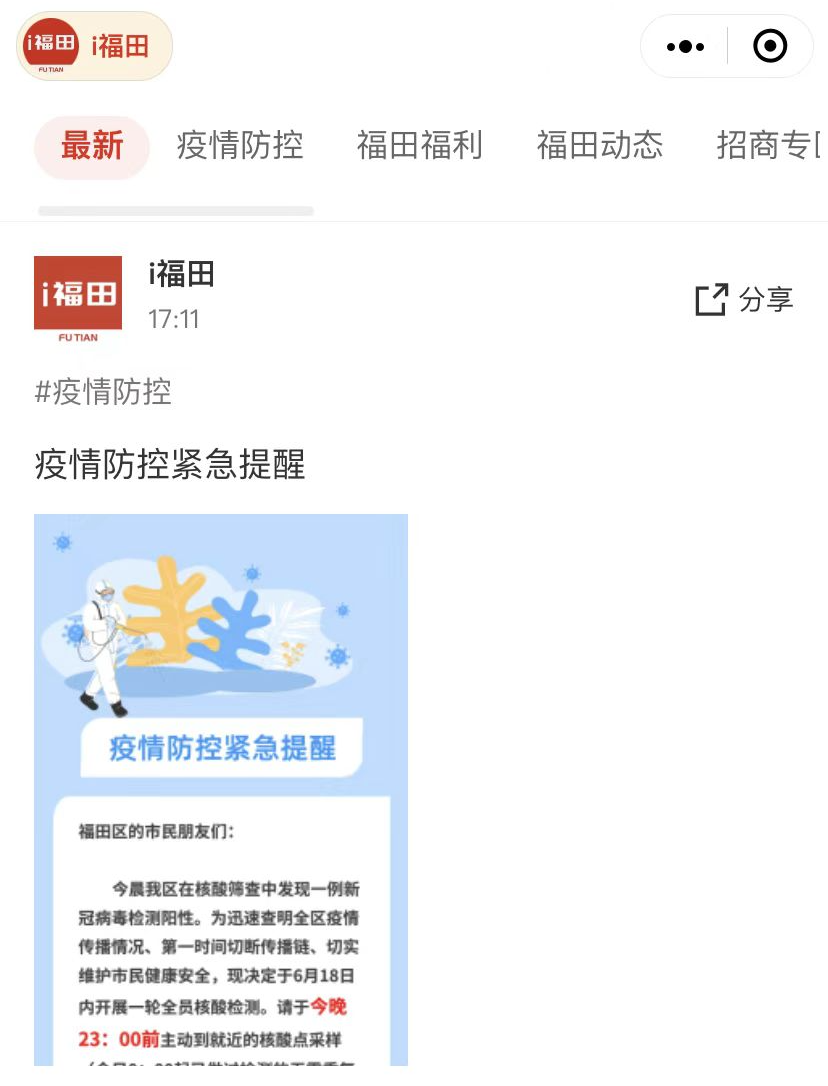 6月18日,深圳市福田区新冠疫情防控指挥部发布疫情防控提醒通知。 通知显示,6月18日清晨福田区在核酸筛查中发现一例新冠病毒检测阳性。 为迅速查明福田区疫情传播情况、第一时间切断传播链、切实维护市民健康安全,决定于6月18日内开展一轮全员核酸检测。 辖区居民请于18日23:00前主动到就近的核酸点采
