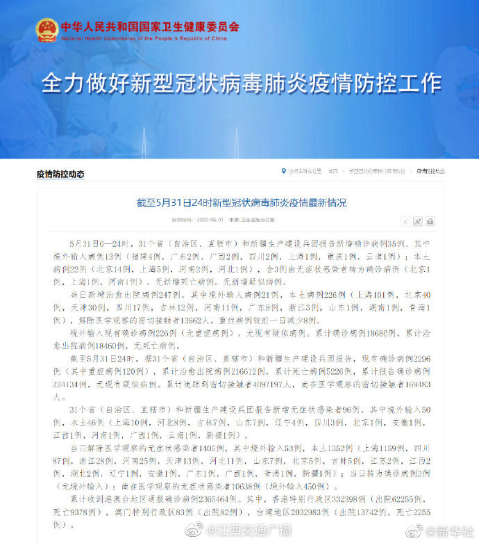 国家卫健委通报,5月31日0—24时,31个省(自治区、直辖市)和新疆生产建设兵团报告新增确诊病例35例。其中境外输入病例13例(福建4例,广东2例,广西2例,四川2例,上海1例,重庆1例,云南1例);本土病例22例(北京14例,上海5例,河南2例,河北1例),含3例由无症状感染者转为确诊病例(北京
