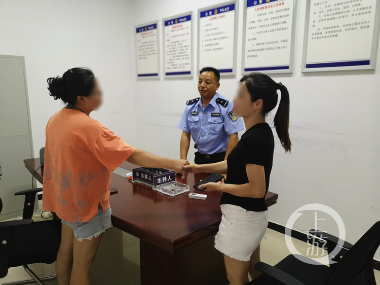 △在派出所调解下,当事双方握手言和(左一为裴大爷儿媳陈某,右一为超市店长张某)。 几天前,在高新区,只因小孙子玩不了游戏,一位老人一气之下便砸了商家的换币机。 7月30日上午,在重庆高新区香炉山街道某小区,腿脚不便的裴大爷骑着电动轮椅带着6岁的小孙子兵兵(化名)到小区附近超市玩游戏机。当爷孙俩来到换