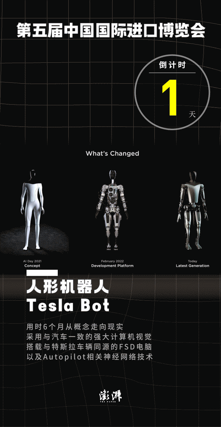 第五届中国国际进口博览会将在上海举行。今年,特斯拉将携S3XY全家族车型、特斯拉机器人、能源架构、超级工厂等最新“科技套装”全面亮相,展示特斯拉以创新推动新能源汽车产业向高阶跃进的不懈努力,为大家创造美好未来的同时,为助力实现“双碳”目标贡献力量。图说:人形机器人 特斯拉供图(下同)本届进博会现场,