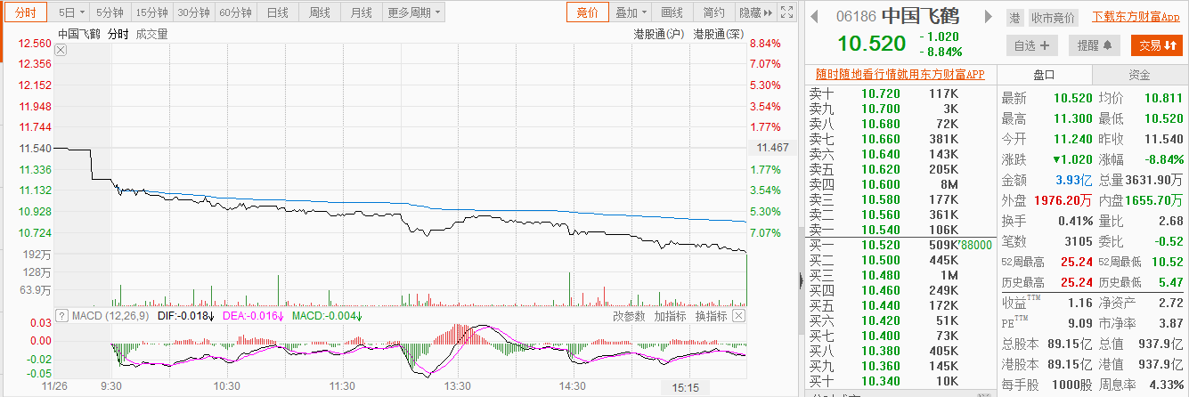 11月26日,有着国产高端奶粉“一哥”称号的中国飞鹤股价再创年内新低,截至当天收盘,报10.52港元/股,跌8.84%,总市值937.9亿港元。AI财经社注意到,中国飞鹤自今年1月下旬创下历史高点后,便开启震荡下行模式。截至11月26日收盘,股价已经较1月21日创下的25.244港元/股的高光时刻跌