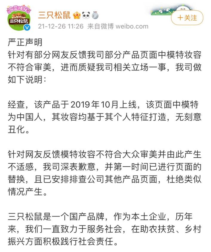 未来网北京12月27日电(记者 凌萌)“眯眯眼”、厚嘴唇……近日,“翻车”不断的三只松鼠又被贴上“丑化”国人的标签。 在零食赛道上,三只松鼠“摸爬滚打”了9年,从一只默默无闻的“小松鼠”,成长为称霸行业的零食巨头。如今,顶着“国民零食第一股”的光环,三只松鼠却光芒不再。 除频频触及食品安全红线外,二