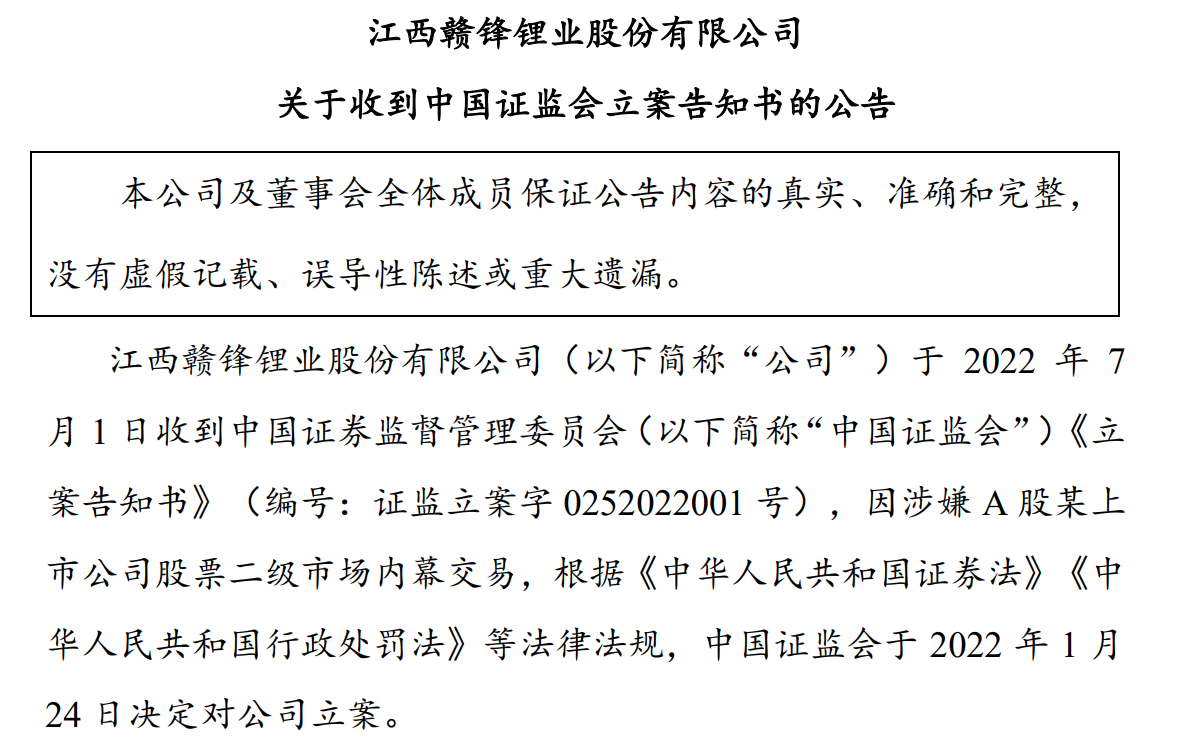 7月3日下午,赣锋锂业公告披露,该公司于7月1日收到中国证监会《立案告知书》:因涉嫌A股某上市公司股票二级市场内幕交易,根据《中华人民共和国证券法》《中华人民共和国行政处罚法》等法律法规,中国证监会于2022年1月24日决定对赣锋锂业立案。赣锋锂业在公告中表示,上述事项不会对该公司的正常生产经营活动