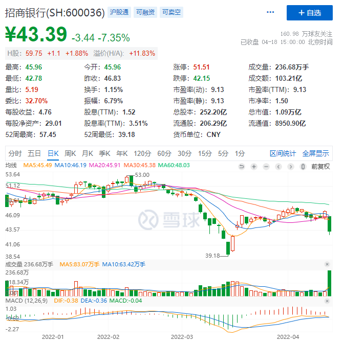 今天股市开盘后,招商银行出现罕见下挫,一度下跌8.31%,随后股价有一定反弹,不过午后开盘继续下跌,一度再次跌破8%,最后收盘下跌了7.35%。成交量也急剧放大,103.21亿,是上周五成交量的5倍多,这一成交量也刷新2015年7月以来新高。招行总市值超过1万亿,今日跌去了868.07亿。招行大跌的