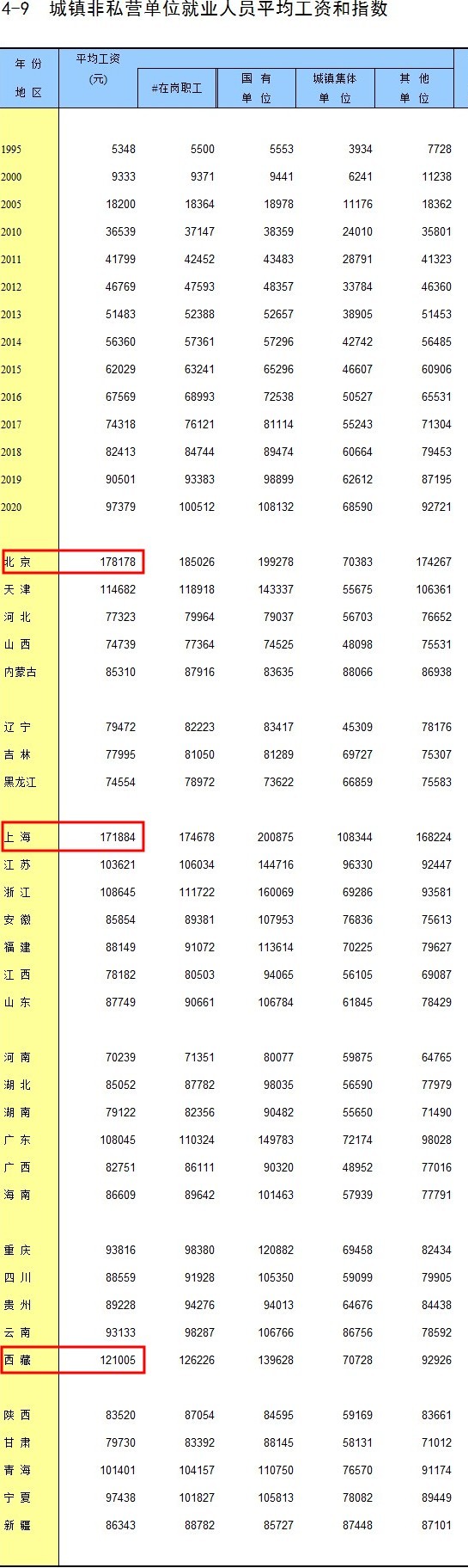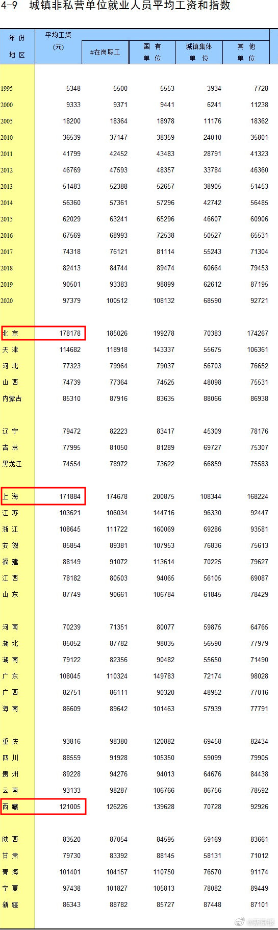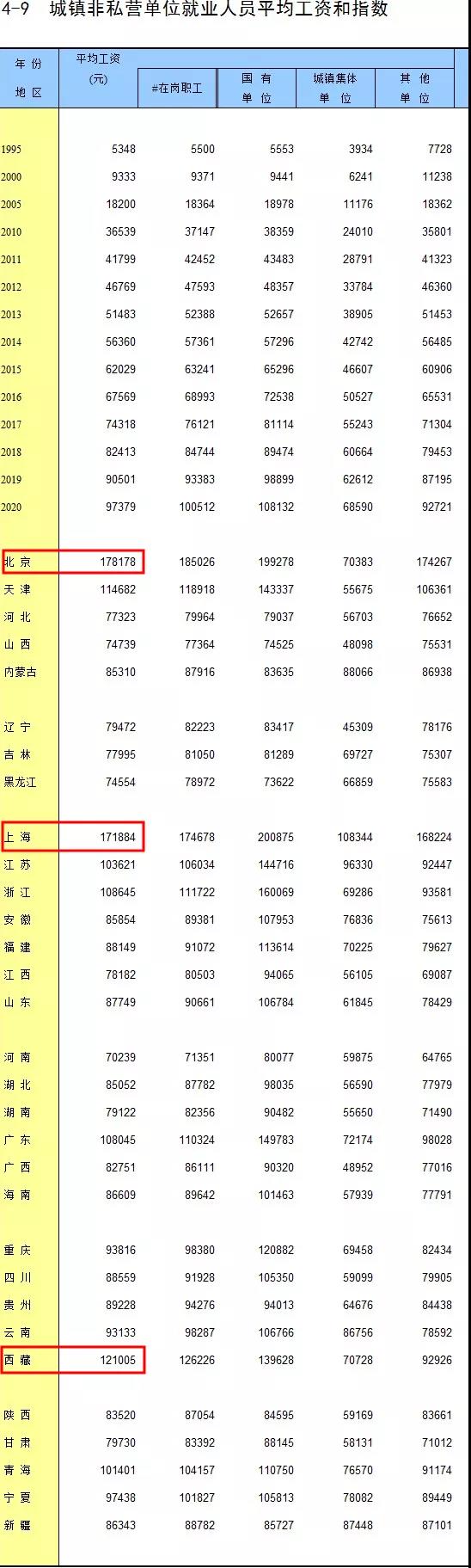 文:余周近日,国家统计局发布了《中国统计年鉴-2021》,这也意味着2020年全国31省份平均工资正式出炉。根据数据可知,2020年全国城镇非私营单位就业人员年平均工资为97379元。其中北京以178178元排列第一,上海以171884元排第二。令人意外的是,西藏以121005排在第三。除此之外,在