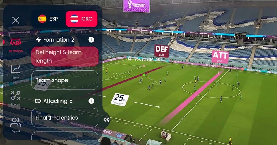 2022卡塔尔世界杯已进入淘汰赛的白热化阶段,国际足联官方应用“FIFA +”则通过AR技术为现场观众提供了一些特殊的观赛体验。 现场球迷只需开启FIFA +,将手机摄像头对准球场。完成校准后,用户就能在手机上查看两队的实时数据,包括阵型、射门次数、进球转化率、犯规次数等。 不仅如此,当用户在手机屏