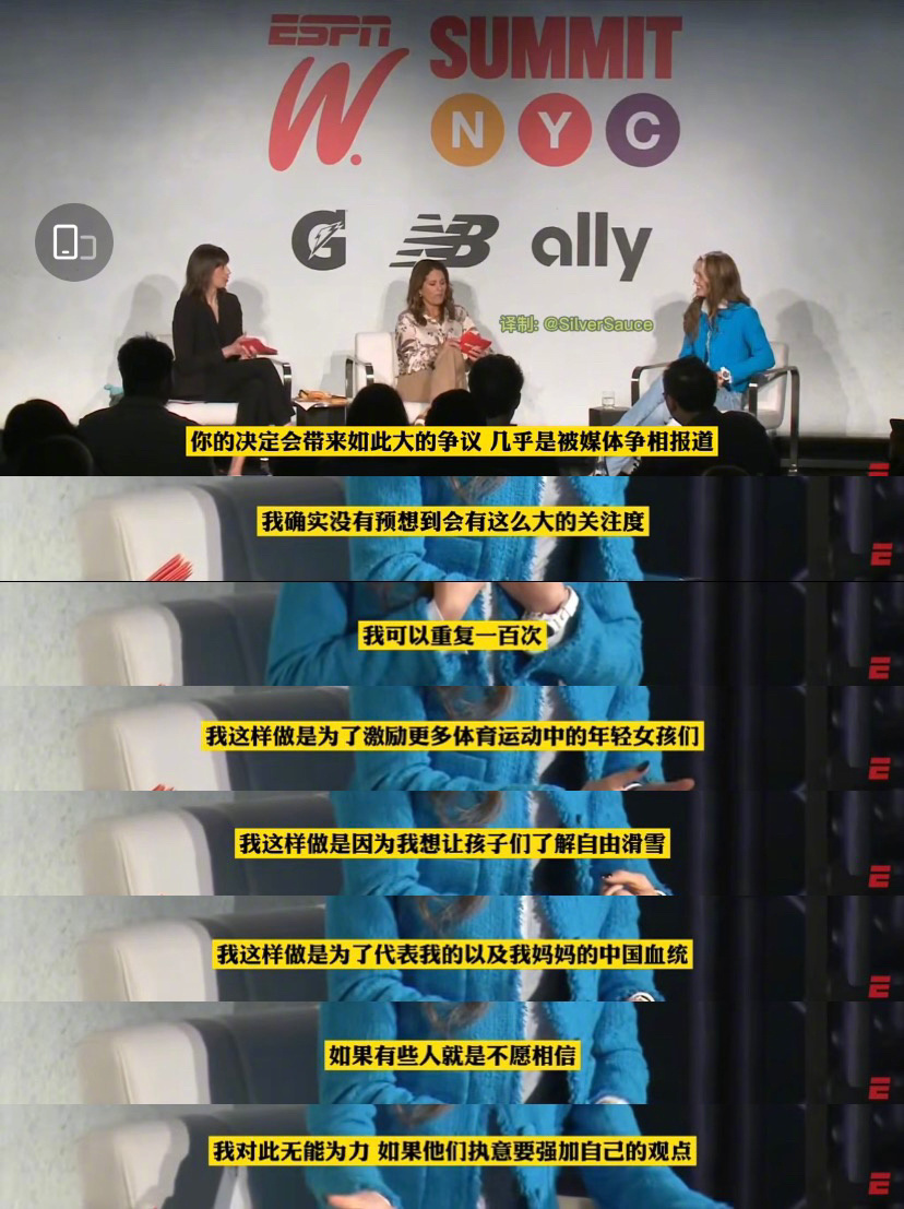 谷爱凌在女性体育峰会上回应了关于自己的一系列争议: “这个世界上没有对和错,就看你的目的是什么,我的目标就是用我自己的方式让世界变得更好,如果有人不认同也没关系,人各有志,我鼓励他们用自己的方式去让世界更好” “我这么做只是为了激励更多体育运动中的年轻女孩们,如果有人就是不相信,人们试图把我塑造成一
